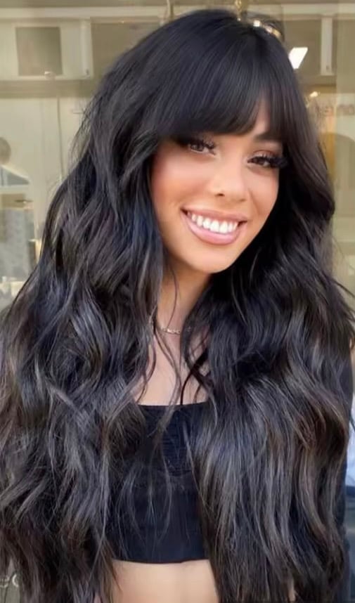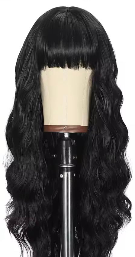 Elevate your look with this black synthetic wig featuring long, voluminous curls and chic bangs. Designed for daily wear or parties, this wig is made from high-temperature resistant fiber that maintains its soft texture and natural shine. Perfect for adding effortless style and confidence to any occasion.